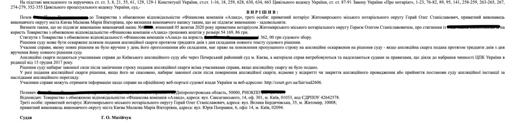 Так, 20.06.2022 року Печерський районний суд міста Києва у повному обсязі задовільнив наші позовні вимоги та визнав виконавчий напис приватного нотаріуса таким, що не підлягає виконанню, а виконавче провадження було закінчено в порядку ЗУ “Про виконавче провадження”.