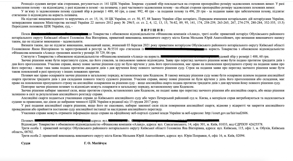 Вже 28.11.2022 року Печерський районний суд міста Києва у повному обсязі задовільнив всі позовні вимоги адвоката та визнав виконавчий напис приватного нотаріуса Головківної Яни Вікторівни таким, що не підлягає виконанню. Ця перемога призвела до закінчення виконавчого провадження стосовно Клієнта, скасування арешту на кошти на рахунках та обтяжень, які були зареєстровані в реєстрі нерухомого майна.